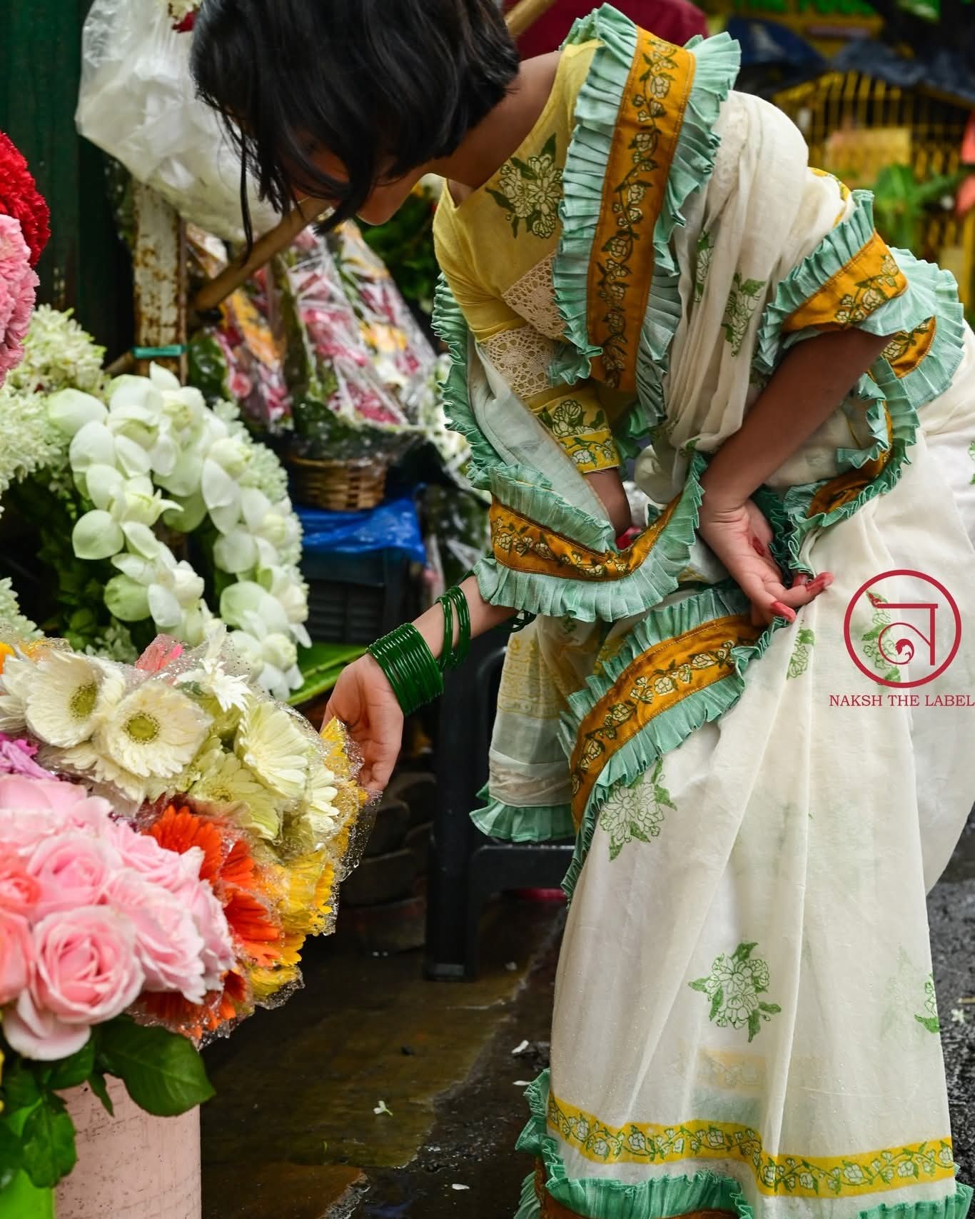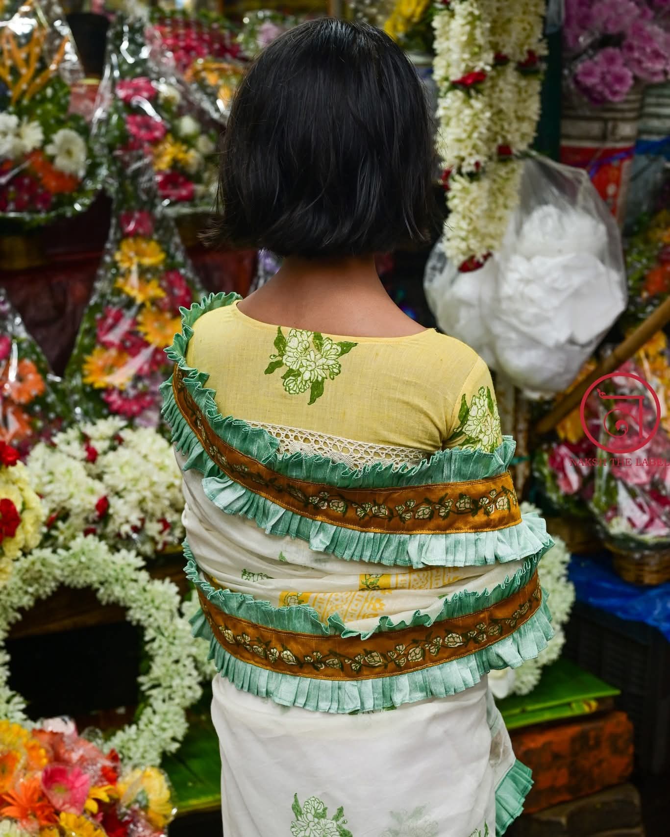 Designed in soft, breezy mul chanderi and hand block printed with fresh mogra blooms — this kids’ saree is made for joy, mischief, and those moments when daughters become our reflection.